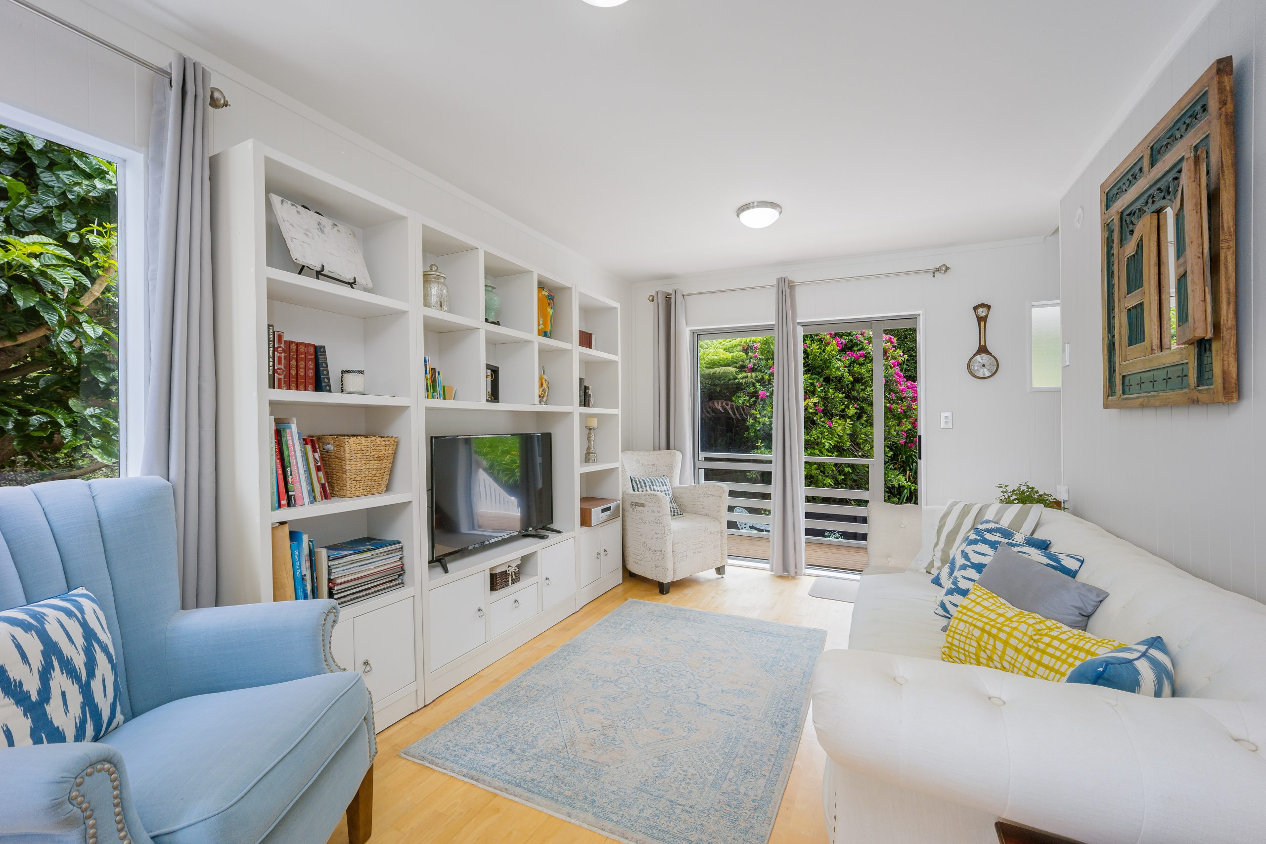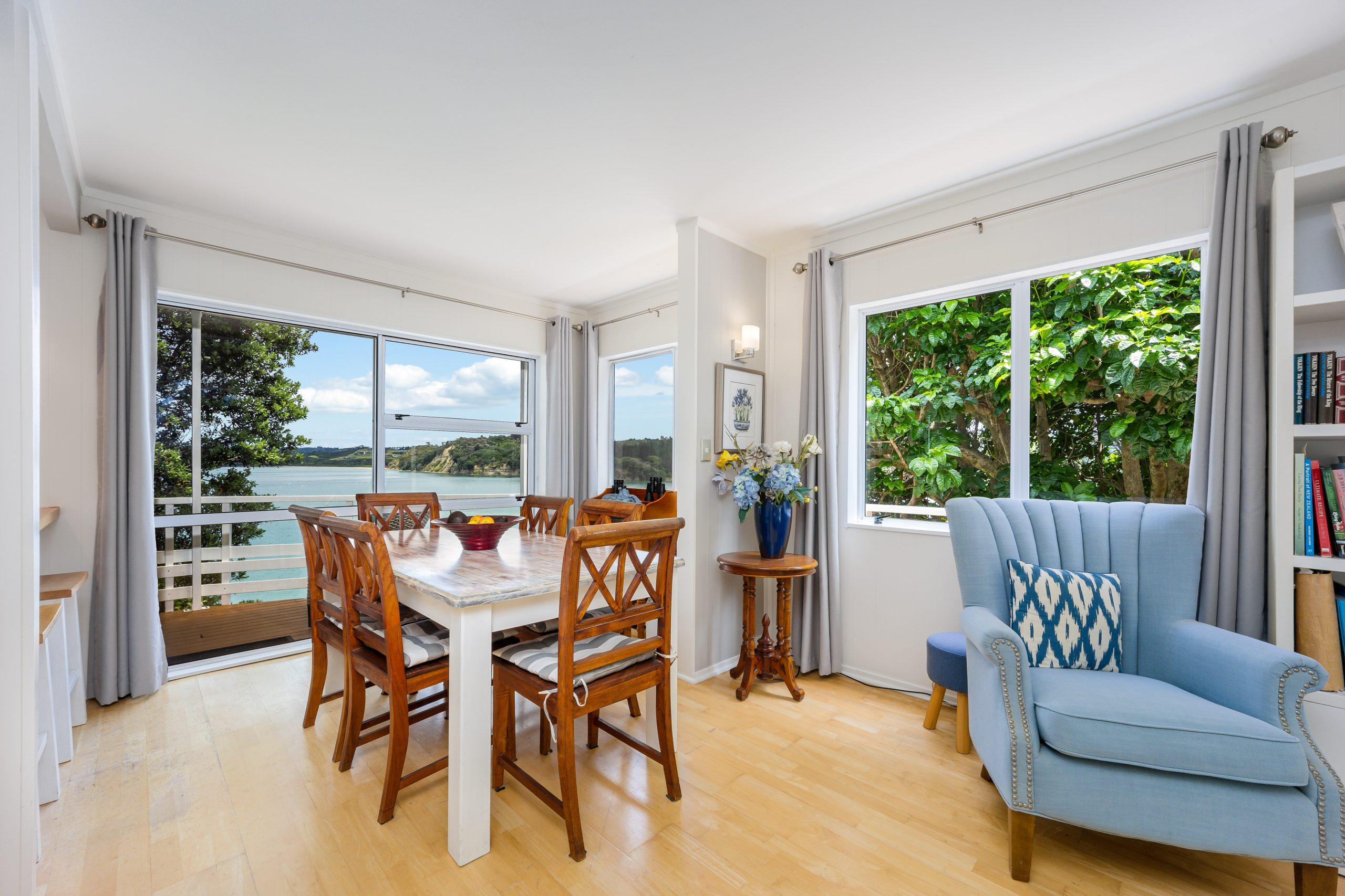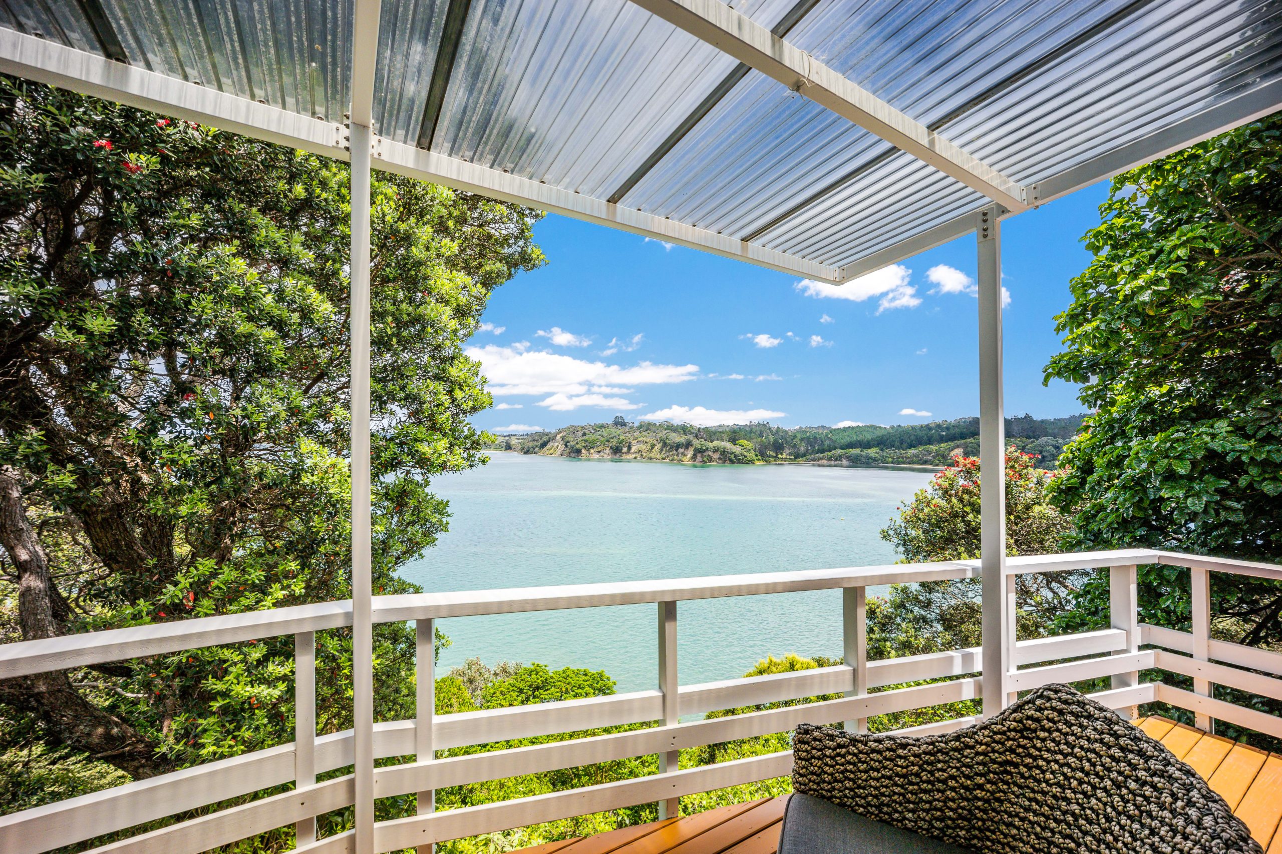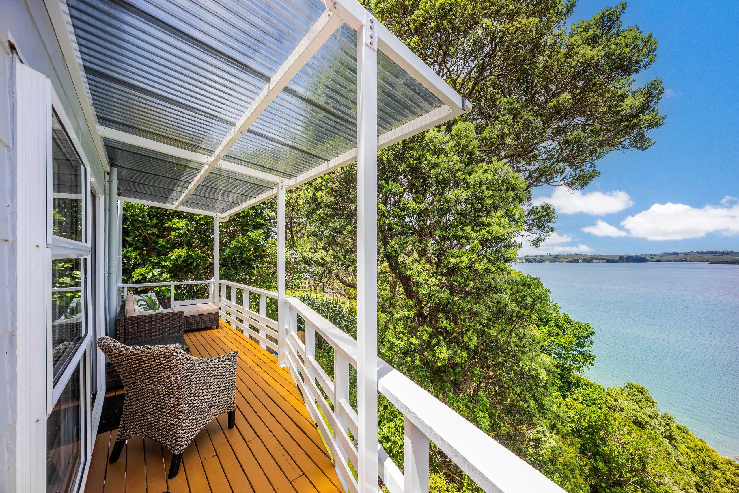 Situated above the mouth of the Weiti River, this charming character home boasts spectacular water views from every angle. It is conveniently located near Arkles Beach, the Wade Boat Club, and all the cafes and restaurants around the Whangaparaoa Coast Plaza. This family home offers more than meets the eye and serves as a peaceful escape in a picturesque natural setting, surrounded by lush greenery and vibrant birdlife, including tui and wood pigeons.
